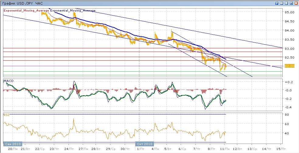 Пара усилила свое снижение и вышла в четверг из нисходящего тренда, преодолев сначала уровень 82.50, а затем и 82.00 в пятницу. Закрепиться на достигнутых уровнях не удалось, пара ушла выше 82.00 к концуторгов пятницы. Сегодняшние торги проходят в ростом, хотя пара открыла торги гэпом вниз. Средние скользящие ЕМА21 и ЕМА55 продолажют снижаются, индикаторы MACD и RSI со вторника находятся под своими центральными линиями и показывают слабый рост с пятницы. Цели вверх на сегодня — оторваться вверх от 82.00, далее 82.30 и 82.50 (с сопротивлением от ЕМА55). Цели вниз — 81.70, далее 81.50 и 81.00.
