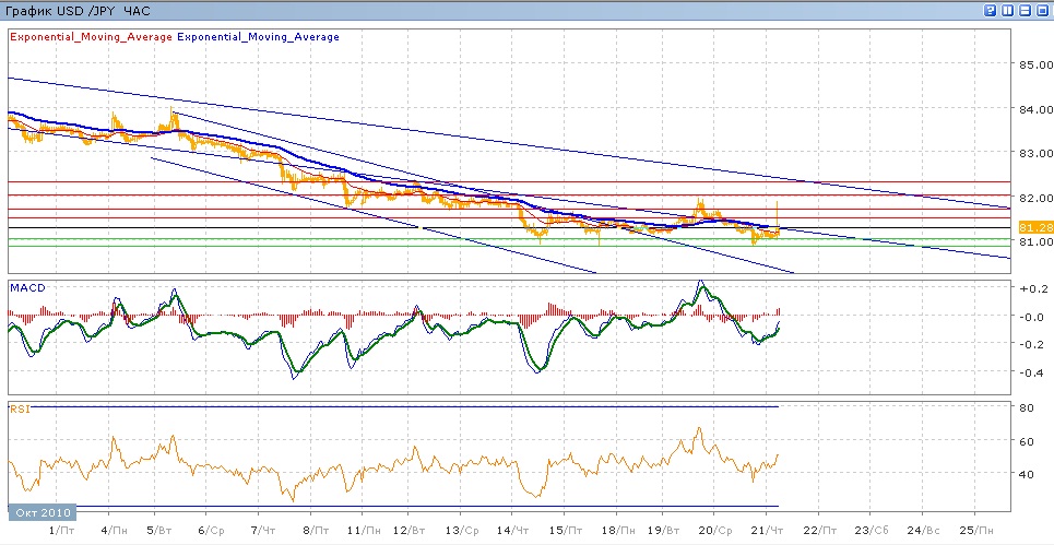 пара ровно неделю движется в коридоре 80.90-81.70. обе границы канала пока что выдерживают давление пары — во вторник была протестирована верхняя граница, от которой пара снижалась вечь вчерашний день, добравшись до нижней границы. В ходе сегодняшних торгов пара пока торгуется парктические на уровне открытия, хотя была предпринята попытка роста, также не сумевшая преодолеть 81.70.Средние скользящие ЕМА21 и ЕМА55 очень медленно снижаются, индикаторы MACD и RSI (после роста вторника -среды) снова находятся под своими центральными линиями и сейчас пытаются расти. Цели вверх на сегодня — 81.50 (с сопротивлением от ЕМА55), далее 81.70, 82.00, далее 82.30 и 82.50 Цели вниз — 81.30, далее 81.00 и 80.87.