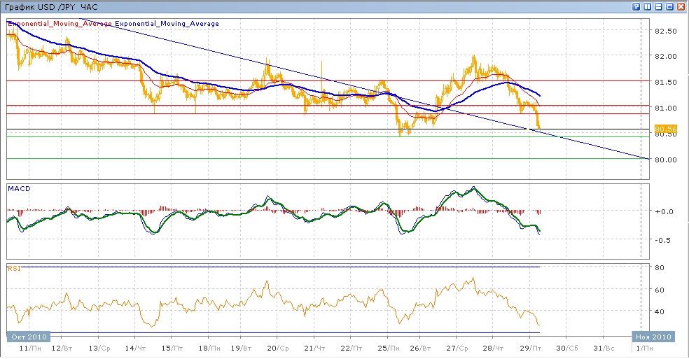 рост пары, начатый в понедельник, завершился в среду, когда после неудачной попытки преодоления отметки 82.00 пара начала откатываться вниз. Это движение продолжилось в четверг, завершившись на уровне 81.00, и сегодня — пара смогла оторваться уверенно вниз от отметки 81.00 и нацелилась, судя по всему, на повторение своего минимума на уровне 80.40. Средние скользящие ЕМА21 и ЕМА55 пересеклись вниз и снижаются, индикаторы MACD и RSI назодятся под своими центральными линиями и снижаются. Цели вверх на сегодня — 80.87, 81.00, 81.50. Цели вниз — 80.40 (минимум от 25 октября), далее 80.00