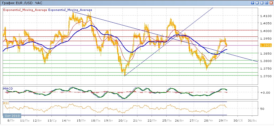 пара продолжает свое движение в пределах 1.3700-1.4000 уже третью неделю. В среду пара снизилась до отмеки 1.3750, после чего в четверг последовал рост на 200 пунктов к 1.3950, который пара не смогла преодолеть и в ходе сегодняшней торговли, снизившись от него к 1.3900.Средние скользящие ЕМА55 и ЕМА21 снова пересеклись вверх и растут, индикаторы MACD и RSI со вчерашнего дня находятся над своими центральными линиями и снижаются.. Целями вверх на сегодня станут 1.3930, далее тестирование 1.3960, затем тестирование 1.4000. Движение вниз будет проверять на прочность уровень 1.3900, далее 1.3850, 1.3800.