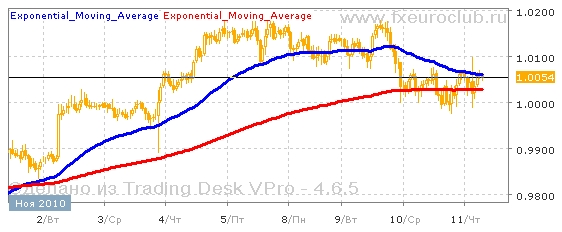 Валютная пара aud/usd в последнее время находится в восходящем канале в границах 1,0000-1,0180. Сейчас котировки находятся в средней части диапазона на уровне 1,0040. Если удастся закрепиться выше уровня 1,0000, то следующей целью роста будет уровень 1,0300. При этом поведение скользящих средних сейчас говорит не в пользу понижения котировок. В настоящее время быстрая скользящая средняя находится над медленной, и обе сейчас движутся горизонтально. Поэтому скорее всего продолжится восходящее движение в рамках восходящего тренда. Если не удастся пройти вверх уровень 1,0200, то возможен отскок вниз до уровня 1,0000.