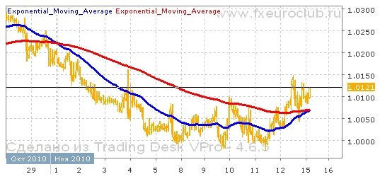 Валютная пара usd/cad последнее время демонстрирует разворот нисходящей тенденции. Движение вниз завершилось отскоком от уровня 0,9980. Затем был пробит вверх уровень сопротивления в районе 1,0070. сейчас котировки находятся в районе 1,0120. Комбинация скользящих средних пока подтверждает сценарий начала повышения котировок. Быстрая скользящая средняя с периодом 55 пересекает снизу вверх медленную с периодом 200, и обе сейчас двигаются с повышением. Поэтому движение в ближайшее время продолжится в сторону повышения с целью пробития уровня сопротивления в районе 1,0300.