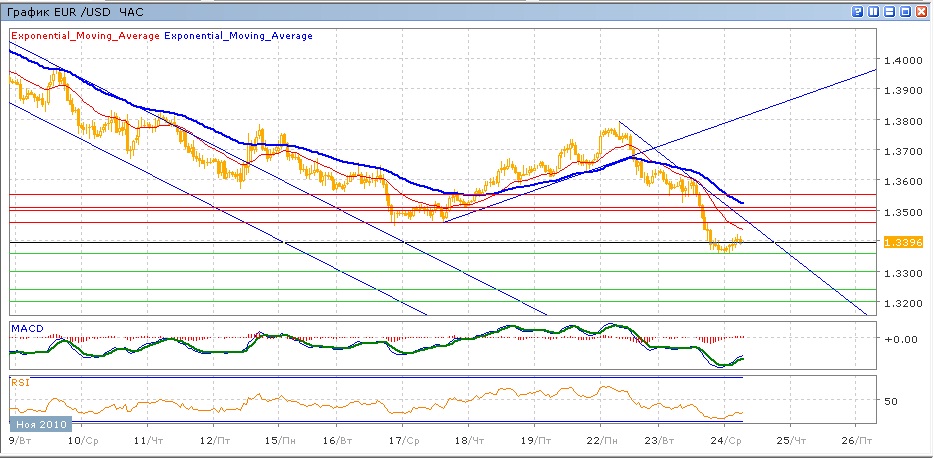 Пара снова начала снижаться. После бодрого начала в понедельник, когда пара почти добралась до уровня 1.3800, последовало мощноие снижение до трехмесячного минимума на уровне 1.3350 на фоне событий вокруг Ирландии и Корейского полуострова. С начала сегодняшних торгов пара торгуется с повышением, пытаясь преодолеть уровень 1.3400. Средние скользящие пересеклись вниз и снижаются, индикаторы MACD и RSI с пятницы находятся под своими центрлаьными линиями и растут. На сегодня цели вверх — 1.3460, далее тестирование 1.3500, затем 1.3550. Цели вниз на сегодня — 1.3360, далее тестирование 1.3300, затем 1.3240.
