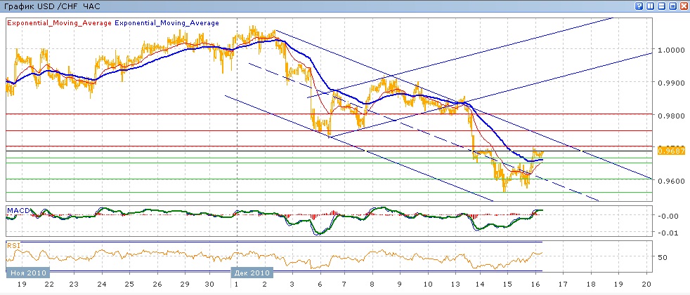 Движение вниз в рамках нисходящего канала, начатого 2 декабря, продолжается. Во вторинк пара добаралась до практически полуторамесячного минимума, дойдя до уровня 0.9560. после чего (учитывая снижение на 200 пунктов в понедельник) пара начала восстанавливаться, закрывшись чера на отмекте 0.9680, в пределах которой пара торгуется и в ходе сегодняшней сессии. Средние скользящие ЕМА21 и ЕМА55 растут и готовятся пересечься вверх, индиктаторы MACD и RSI со вчерашнего дня вышли над своими центрлаьными линиями и сегодня очень слабо растут. На сегодня целями вверх станет преодоление 0.9700, далее 0.9750, 0.9800. Движение вниз направлено 0.9665, далее 0.9650, 0.9600.