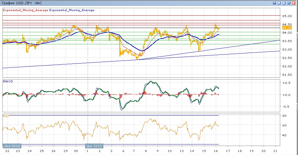 начатое снижение в понедельник продолжилось и во вторник, когда пара попыталась укрепиться под отметкой 83.00. попытка оказалось неудачной, полседовало восстановление пары до уровня 84.30 — 84.40, который пара снова не смогла предолеть в очердной раз за более чем 2 недели. Закрылась пара вчера на уровне 84.20, где и торгуется в ходе сегодняшних торгов. Средние скользящие ЕМА21 и ЕМА55 пересеклись вверх и растут, индикаторы MACD и RSI находятся над своим центральными линиями и сейчас снижаются. Цели вверх на сегодня — 84.40, 84.70, 85.00. Цели вниз — 84.00, 83.80 (с поддержкой от ЕМА55), 83.60