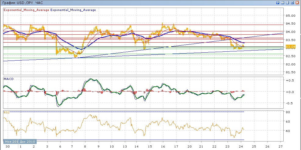 пара продолжила свое снижение, двигаясь с 8 декабря в канале 82.90-84.00, исейчас находится около нижней границы канала. Вчерашние попытки ее преодолеть оказались неудачны и с начала сегодняшней сеессии пара торгуется со слабым повышением, пытаясь преодолеть 83.00. Средние скользящие ЕМА21 и ЕМА55 снижаются, индикаторы MACD и RSI третий день находятся под своими центральными линиями и сейчас слабо растут. Цели вверх на сегодня — 83.30 (с сопротивлением от ЕМА55), далее 83.50-83.60, 83.80, 84.00. Цели вниз — 83.00-82.90, затем 82.60, далее 82.35 (минимум от 7 декабря).