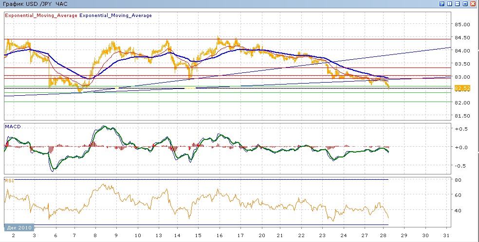 пара продолжила свое снижение, преодолев нижнюю границу канала 82.90-84.00. сейчас пара тестирует на прочность поддержку 82.60, к оторой она снизилась за сегодняшнюю сессию от уровня 83.00 и находится в каких-то 20 пунктах от своего 3-недельного минимума на 82.35. Средние скользящие ЕМА21 и ЕМА55 снижаются, индикаторы MACD и RSI пятый день находятся под своими центральными линиями и сейчас увернно снижаются.. Цели вверх на сегодня — 83.00-82.90, 83.30. Цели вниз — 82.60, далее 82.35 (минимум от 7 декабря), затем 82.00.