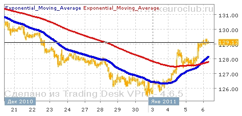 Валютная пара gbp/jpy сейчас демонстрирует разворот нисходящей тенденции. После достижения очередного минимума в районе 125,40 цены постепенно поднялись до уровня 129,30. Пока дальнейшего движения вверх не последовало и котировки сейчас немного корректируются вниз. В данный момент цены консолидируются примерно в верхней части диапазона вблизи отметки 129,00. При этом продолжение тренда будет выяснено после выхода котировок за пределы сложившегося диапазона колебаний 127,30-129,00. Комбинация скользящих средних с периодами 55 и 200 сейчас находится в положении восходящего тренда, поскольку быстрая линия пересекла снизу медленную. И обе средние сейчас движутся с повышением, поэтому есть ещё уверенность что повышение котировок может продолжиться. Понижение котировок валютной пары gbp/jpy выглядит менее вероятным пока действует уровень поддержки в районе 127,30. В обратном случае возможно возвращение в район 126,00.