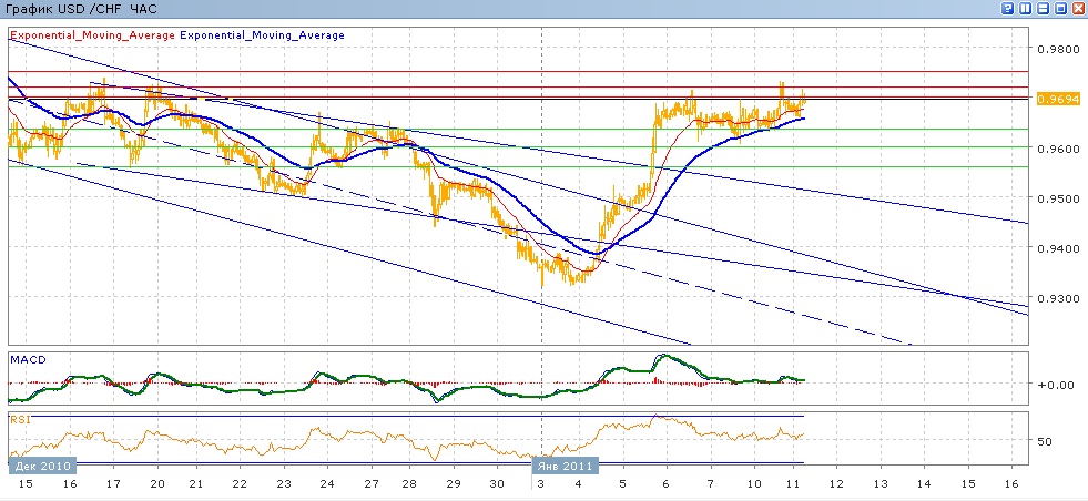 с 6 января подавляющая часть движения пары приходится на боковйо канал в диапазоне 0.9635-0.9700. вчерашняя попытка роста вверх и закрепления выше 0.9700 не удалась, пара откатилась снова в канал. С начала сегодняшних торгов пара немного растет, все также нацелившись на 0.9700. Средние скользящие ЕМА21 и еМА55 замедлили свой рост, индикаторы MACD и RSI шестой день находятся над своими центральными линиями и пока стабилизировались. На сегодня целями вверх станет преодоление 0.9700, далее 0.9720, 0.9750. Движение вниз направлено 0.9635, далее 0.9600 (с поддержкой от ЕМА55), 0.9560