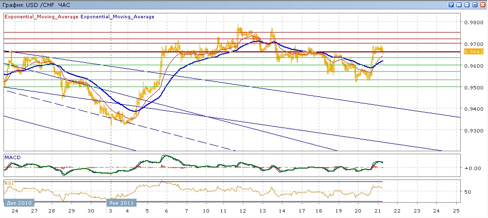 Начавшееся 11 января снижение приостановилось 19 января на поддержке 0.9530, которая вчера во второй половине дня снова была проверена на прочность, после чего пара резко пошла вверх, набрав около 150 пунктов и немного не добравшись до 0.9700. с начала сегодняшних торгов пара немного снижается. Средние скользящие ЕМА21 и ЕМА55 пересеклись вверх и растут, отражая вчерашний резкий рост. Индикаторы MACD и RSI вчера закрепились выше своих центральных линий и сейчас слабо снижаются. На сегодня целями вверх станет преодоление 0.9660, далее 0.9700, 0.9720. Движение вниз направлено 0.9635, затем 0.9600 (с поддержкой от ЕМА55), далее 0.9570