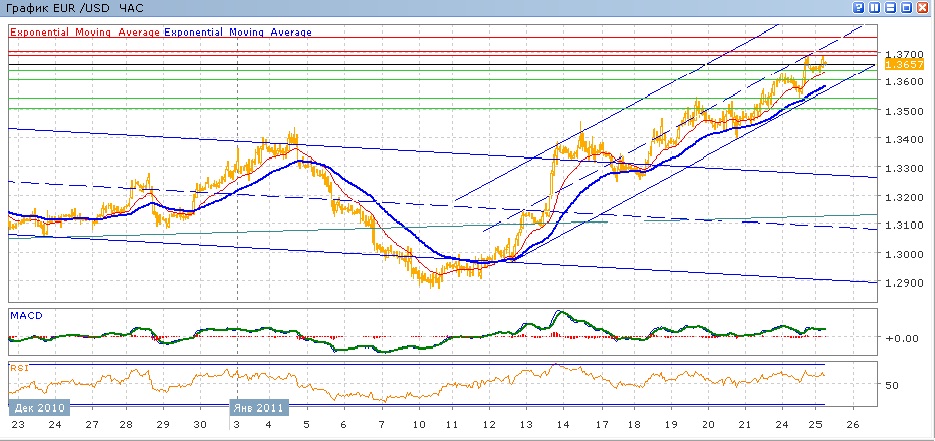 замедлившийся в среду и четверг рост пары в пятницу был продолжен преодолением отметки 1.3500 и последующим закреплением на уровен 1.3600. вчера, после небольшой коррекци вниз, пара снова начала расти, показав более чем двухмесячный максимум на 1.3680. с начала сегодняшних торгов пара снова, умеренно, растет, в настоящий момент откатившись от 1.3680. в целом пара движется в нижней части восходящего канала. Средние скользящие ЕМА21 и ЕМА55 продолжают свой рост, индикаторы MACD и RSI находятся над своими центральными линиями и сегодня слабо растут. На сегодня цели вверх — преодолеть 1.3680, далее 1.3700, 1.3750. Цели вниз на сегодня — 1.3635, далее1.3600, 1.3540