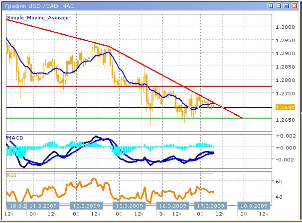 Разнородный рост фондовых индексов и проблемы с автопромышленным сектором, стали причиной падения доллара США против канадской валюты, которая в значительной степени зависит от американской экономики. Снижение достигло уровня поддержки, который уже ранее тестировался, и был преодолен мощным движением. Ожидается продолжение текущей тенденции, поскольку фундаментально ситуация не изменилась, некоторое препятствие медведям окажет ожидаемое снижение на американских фондовых рынках на этой неделе. Технические индексы указывают на продолжение нисходящего тренда. Осциллятор MACD близок к подаче двойного сигнала на продажу, пересечение гистограммой нулевой оси, и соответствующее пересечение скользящих средних. Грайик индикатора RSI не долго пребывал около среднего уровня, и в очередной раз коснувшись его, устремился вниз. Такие сигналы не являются надежными, но достаточно красноречиво говорят, о том, что коррекция в среднесрочном периоде не ожидается.
