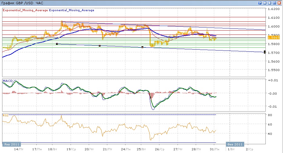 в целом пара медленно снижается две недели, так и не сумев пока что закрепиться выше уровня 1.6000. после неудачной попытки в четверг добраться до отметки 1.6000 пара начала снижаться, закрывшиьс в пятницу чуть выше отметки 1.5850. с начала сегодняшних торгов пара торгуется на уровне открытия. Средние скользящие ЕМА21 и ЕМА55 пересеклись вниз и медленно снижаются, индикаторы MACD и RSI находятся под своими центральными линиями и медленно растут. Цели на сегодня вверх — отоваться от 1.5900, далее 1.5950 и 1.6000. Движение вниз будет направлено на 1.5850, 1.5830, 1.5800, 1.5750