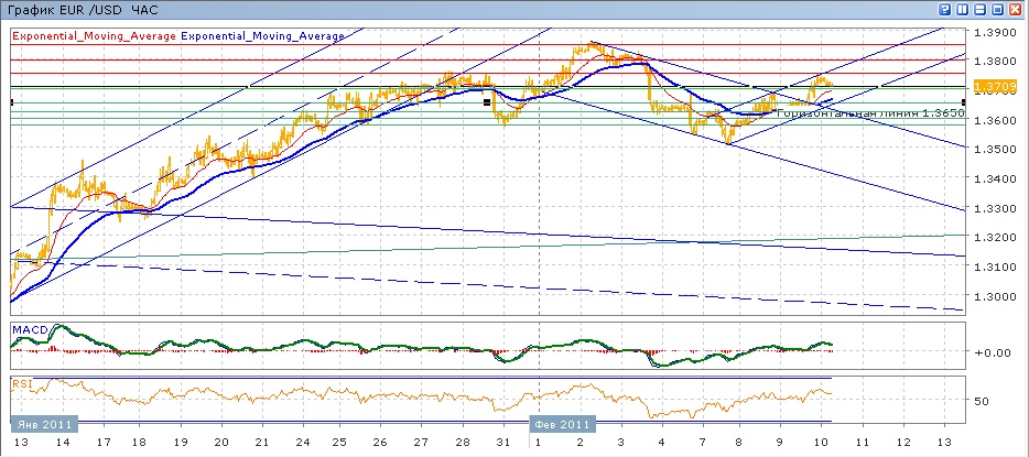 после недельного снижения от 1.3850 до 1.3500 пара с 7 февраля начала расти. Вчера пара смогла оторваться от 1.3600 и закрыться выше 1.3700, к которому снова снижается с начала свегдняшних торгов. Средние скользящие ЕМА21 и ЕМА55 снова пересеклись вверх после некоторого снижения и сейчас растут, индикаторы MACD и RSI уже третий день над своими центральными линиями и слабо снижаются. На сегодня цели вверх — 1.3750, дале 1.3800. Цели вниз на сегодня — преодоление 1.3700, далее 1.3650, 1.3620 и 1.3600