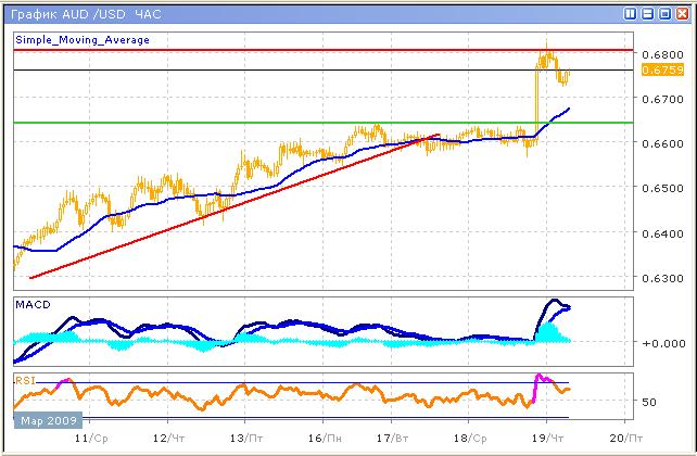 Уровень сопротивления 0.6640, который стал теперь поддержкой, был преодолен стремительным броском цен, вызванным новостями из США. В краткосрочной перспективе ожидается снижение, на что указывают технические и фундаментальные факторы. Осциллятор MACD сигнализирует об остром спаде движущей силы возрастающего тренда, гистограмма упала почти до нуля, и в случае ее пересечения возникнет сигнал на продажу, с целью снижения к отметке 0.6680. Скользящие средние индикатора также находятся в предсигнальном состоянии. График индикатора RSI сигнализирует о возможном снижении, выйдя из зоны перекупленности, и направляясь вниз.