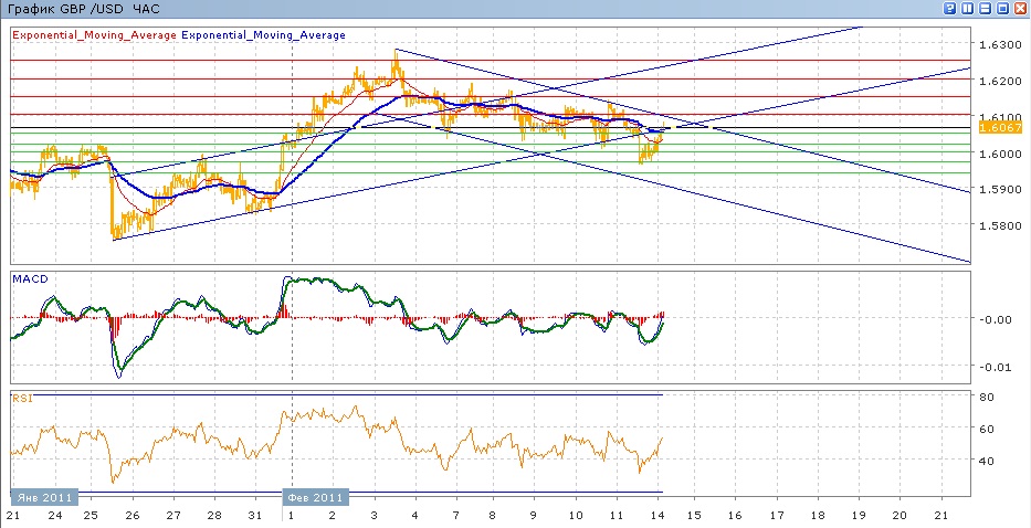 медленное снижение пары с 3 февраля продолжается, пара в четверг преодолела вниз поддержку на уровне 1.6050. в, но задержаться там надолго не смоглачера пара и в пятницу закрылась выше 1.6000. С начала сегодняшней торговли пара растет, пытаясь закрепиться выше 1.6050.Средние скользящие ЕМА21 и ЕМА55 медленно снижаются, индикаторы MACD и RSI находятся под своими центральными линиями и готовятся выйти выше своих центральных линий. Цели на сегодня вверх — 1.6100, далее 1.6150, затем 1.6200. Движение вниз будет направлено на 1.6050 ( с поддержкой от ЕМА55), 1.6020, затем 1.6000 с возможным продолжением к 1.5970.