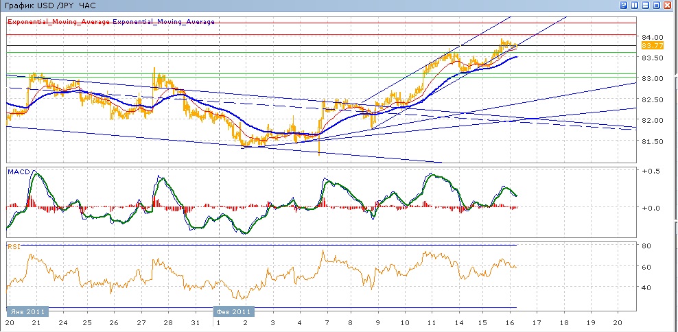 пара продолжает с 1 февраля медленно расти. В конце торгов понедельника рост пары несколько замедлился, она сделала попытку выхода вниз из восходящего канала, что удалось паре сделать во вторник, но это оказался выход кратковременный и пара снова зашла в канал. При этом ее движение проиходит теперь пока что в его нижней части. Сегодняшние торги пара проводит слабо, балансируя на нижней границе канала. Средние скользящие ЕМА21 и ЕМА55 в целом растут, индикаторы MACD и RSI находятся над своими центральными линиями и также сейчас снижаются. Цели вверх на сегодня — 84.00, 84.30. Цели вниз — 83.60, 83.00-83.10