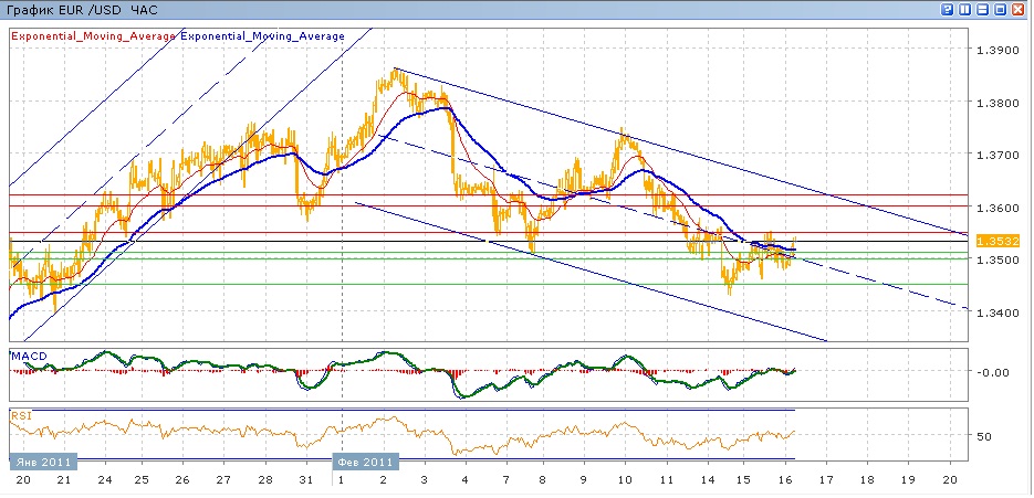 в целом пара меделенно снижается. В понедельник после достаточно резкого нсижения на 100 пунктов пара получила поддержку на уровне 1.3450, от которого начала постепенно расти. Рост вчера остановился на сопротивлении 1.3550, которое уже четвертый день является непреодолимым для пары. Средние скользящие ЕМА21 и ЕМА55 замедляют свое снижение, индикаторы MACD и RSI готовы пересечь вверх свои центральные линии. На сегодня цели вверх — 1.3550, далее 1.3600, затем 1.3620. Цели вниз на сегодня — преодоление 1.3510-1.3500, далее 1.3450