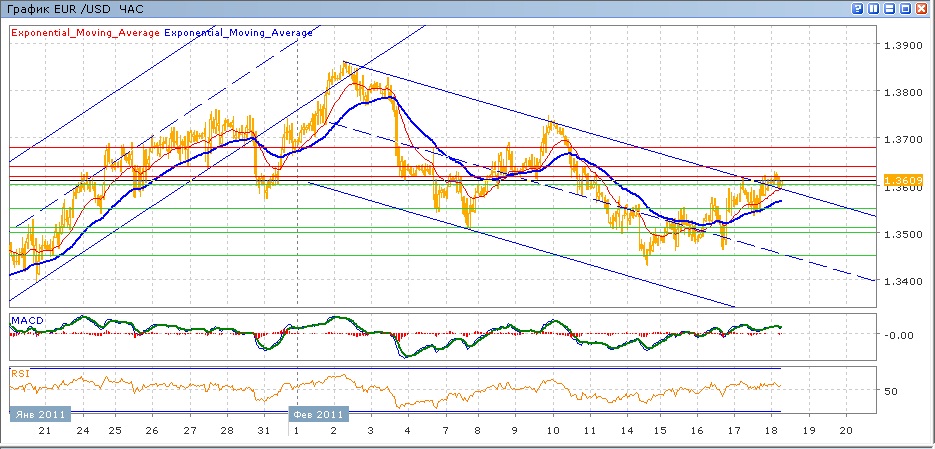 с понедельника пара продолжает медленный рост. В среду активная динамика торговли в диапазоне более 100 пукнтов витоге закрыла пару на уровне 1.3580, от которого она вчера медленно добралась до отметки 1.3600, преодолев сопротивление этого уровня и верхней границы нисходящего канала. Сейчас пара торгуется на цене открытия после небольшого роста и последовавшего затем снижения с тестированием 1.3600. Средние скользящие ЕМА21 и ЕМА55 пересеклись вверх, индикаторы MACD и RSI вышли над своими центральными линиями. На сегодня цели вверх — 1.3620, далее 1.3640 и 1.3680. Цели вниз на сегодня — преодоление 1.3600, далее 1.3550, затем 1.3510-1.3500