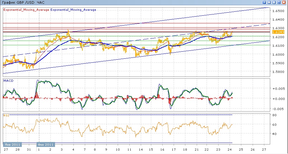 пара продолжает свой рост в пределах нижней части восходящего канала. Во вторник пара скорректировалась вниз к отметке 1.6100, от которой снова начала расти, добравшись вчера до отметки 1.6250 (уровня начала февраля) и затем немного откатилась вниз. Сегодня пара снова растет, пытаясь вновь пробить сопротивление на 1.6250. Средние скользящие ЕМА21 и ЕМА55 в целом растут, индикаторы MACD и RSI находятся над своими центральными линиями и сейчас продолжают расти. Цели на сегодня вверх — 1.6280 , далее 1.6300, затем 1.6350 Движение вниз будет направлено на 1.6200 (с поддержкой от ЕМА21 и ЕМА55), далее 1.6150, затем 1.6100