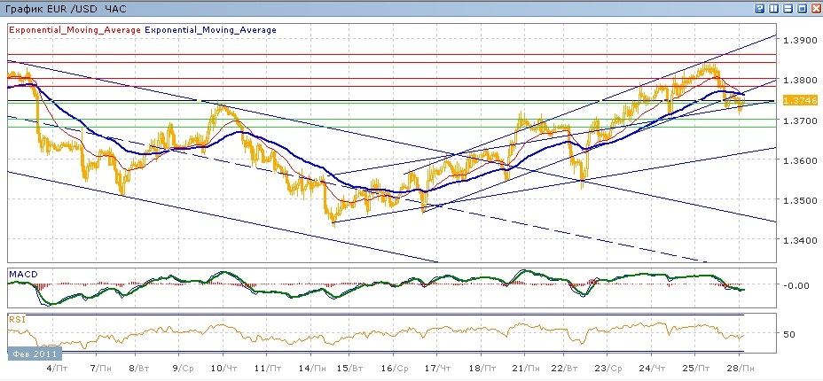 рост пары продолжается. Двигаясь в четверг и пятницу в пределах канала, пара добралась до отметки 1.3840, немного не добрав до практически месячного максимума на 1.3860 от 2 февраля.но затем она начала снижаться, закрывшись в пятницу на 1.3750. сейчас пара торгуется на уровне открытия, Средние скользящие ЕМА21 и ЕМА55 готовятся пересечься вниз, индикаторы MACD и RSI в пятницу ушли под своим центральные линии и пока что стабилизировались. На сегодня цели вверх — 1.3780, 1.3800, 1.3840, далее 1.3860. Цели вниз на сегодня — 1.3740, затем 1.3700, 1.3680