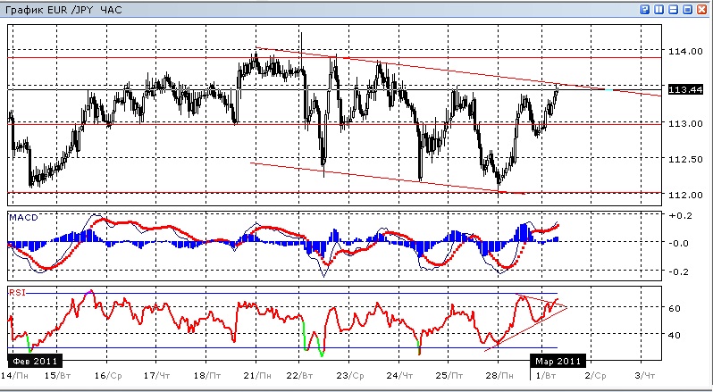 После тестирования уровня сопротивления в районе 114,00 пара движется в пологом нисходящем канале. Уровень верхней границы канала достаточно близок, это сопровождается уменьшением силы индикатора RSI и слабо выраженным ростом сигнальной линии MACD. Схождение RSI в треугольнике может предвосхищать замедление роста пары перед верхней границей канала. Близка плотная зона сопротивления в районе 113,5.
