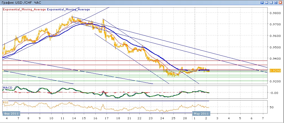 с 25 февраля пара медленно растет, корректируясь после двухнедельного снижения. Тем не менее, в понедельник и вторник паре не удалось закрепиться выше уровня 0.9300, откатившись под него. сегодня в ходе торгов очень слабо торгуется, встречая сопротивление от средних скользящих ЕМА21 и ЕМА55, которые сегодня немного снижаются. Индикаторы MACD и RSI после небольшого роста в понедельник и вторник ушли снова под свои центральные линии. На сегодня целями вверх станет преодоление 0.9300, 0.9340, 0.9380. Движение вниз направлено на тестирование 0.9280, далее 0.9250, 0.9233 (минимум пятницы) и далее 0.9200.