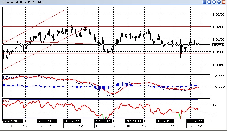 Пара продолжает находиться в коридоре 1,0090 — 1,0200, от нижней границы которого она оттолкнулась в пятницу, однако это движение не демонстрирует силы: гистограмма MACD на часовом графике готовится пересечь нулевую линию вниз. На дневном графике пара остается в восходящем треугольнике. Пока стоит воздержаться от решения относительно движения пары.