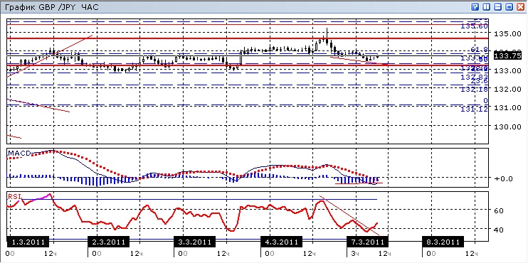Пара откатилась после тестирования сопротивления на отметке 134,65. Движущая сила восходящей тенденции была изначально слаба, чтобы пробить уровень вверх, кратковременный прокол уровня был обеспечен сугубо фундаментальными факторами в середине прошлой торговой сессии. Однако и сила продавцов тоже весьма ограничена: это иллюстрируется расхождением минимумов ценового графика и минимумов гистограммы MACD. В тоже время график RSI подает слабый сигнал на покупку, пробив свою линию сопротивления.