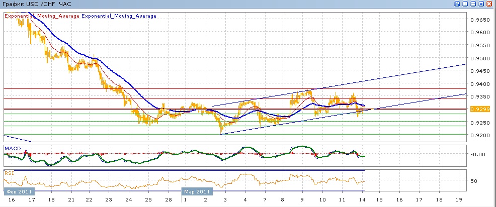 со 2 марта пара движется в рамках восходящего канала. В пределах этого канала пара 10 и 11 марта двагалась в небольшом боковике, в итоге к пятнице закрывшись под 0.9300, у самого края нижней границы канала. С начала сегодняшинх торгов парапытается преодолеть вверх этот уровень, нопока безуспешно. Средние скользящие ЕМА21 и ЕМА55 медленно растут в целом и сейчас пересеклись вниз, индикаторы MACD и RSI снова находятся под своими центральными линиями и сейчас медленно растут вверх. На сегодня целями вверх станет преодоление 0.9300, 0.9340, 0.9380. Движение вниз направлено на тестирование 0.9280, 0.9250, далее 0.9235, 0.9200.