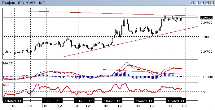 На часовом графике замечается расхождение между максимумами цен и максимумами MACD, что говорит в пользу краткосрочного снижения, однако для большей обоснованности данного сигнала, необходимо преодоление линии краткосрочного восходящего тренда или уровня сопротивления 0,9800. Сейчас пара находится в узкой консолидации на отметке 0,9920. Предпочтительное направление выхода из неё — вниз.