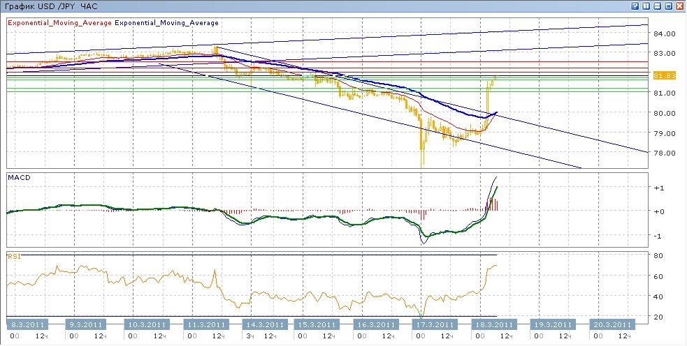 движение йены в целом совпадает с дфижением швейцарского франка. Пара также двигалась в рамках нисходящего канала, спускаясь к его нижней границе. Затем последовал резкий рост йены, показавшей исторический минимум на уровне 76.44 с последующим восстановлением к 79.50. оставшуюся часть четверга пара торговалась в районе отметки 79.00. с начала сегодняшних торгов пара пошла в рост, преодлев более 250 пунктов и нацелившись на отметку 82.00. Средние скользящие ЕМА55 и ЕМА21 снижаются, но готовятся к пересечению вверх, индикаторы MACD и RSI сегодня вышли вверх над своими центральным линиями и продолжают расти.. Цели вверх на сегодня — 82.00, 82.20, 82.50. Цели вниз — 81.60-81.70, 81.20, 81.00
