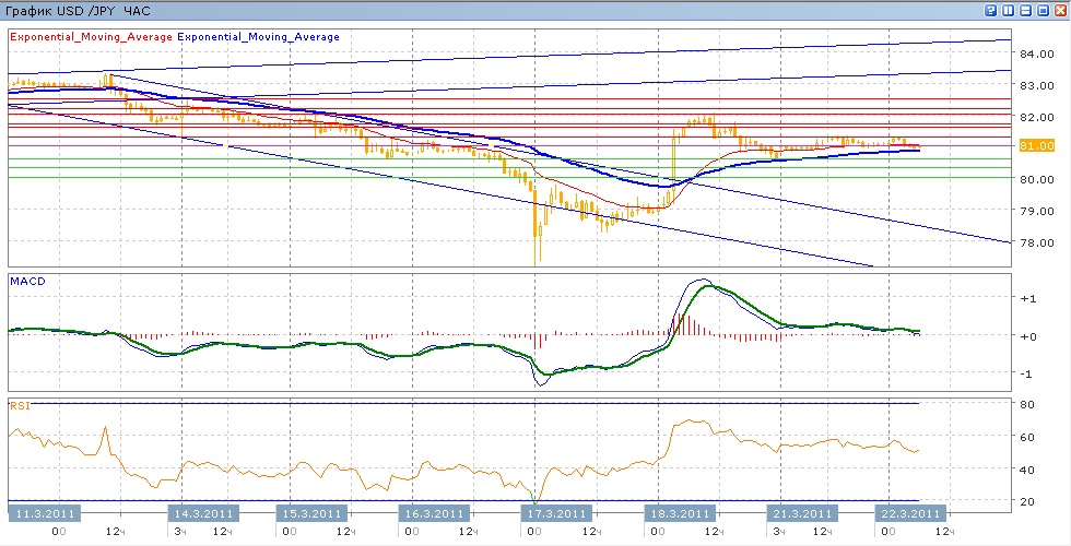движение йены в целом совпадает с движением швейцарского франка. 18 марта в пятнциу пара показала более чем уверенный рост, показав в своем максимуме отметку выше 82.00, начав рост с уровня 79.00 и закрывшись в районе 80.50. вчера пара двигалась в узком боковом коридоре, двигаясь вокруг уровня 90.00, проделывая и сегодня то же самое. Средние скользящие ЕМА55 и ЕМА21 пересеклись вверх и медленно растут, индикаторы MACD и RSI после мощного роста в пятницу с середины 18 марта снижаются и очень лблизки к пересечению своих центральных линий вниз. Цели вверх на сегодня — 81.30,81.60-81.70, 82.00. Цели вниз — 81.00, 80.60, 80.30. 80.00