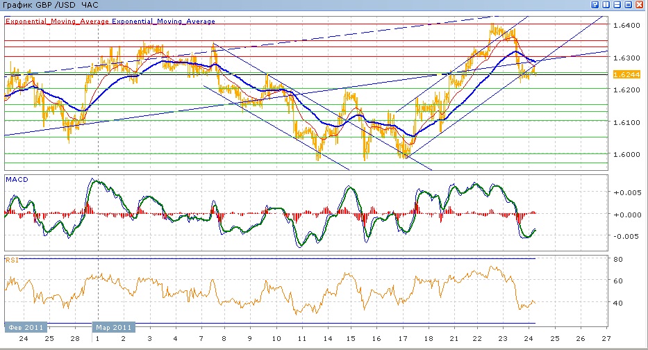 во вторник пара усилила свой рост, и выйдя кратковременно вверх из восходящего канала, протестировала уровень 1.6400, после чего начала медленно снижаться, резко усилив свое снижение во второй половине среды. Итогом стало достижение парой уровня 1.6250, выступившего поддержкой. С начала сегодняшних торгов пара торгуется вокргу этого уровня. Средние скользящие ЕМА21 и ЕМА55 пересеклись вниз и снижаются, индикаторы MACD и RSI вчера опустились под свои центральные линии и сегодня несколько растут. Цели на сегодня вверх — 1.6300, 1.6330, затем 1.6350 , далее 1.6400. Движение вниз будет направлено на 1.6250, 1.6200, далее 1.6150.