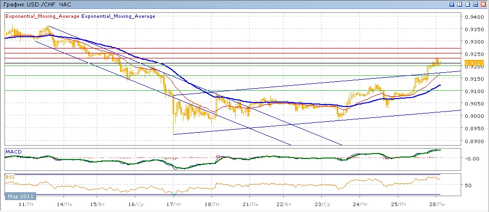 с 23 марта пара начала расти, в пятницу усилила свой рост и вышла вверх из восходящего канала, закрепившись выше уровня 0.9200 и показав таким образов двухнедельный максимум. С начала нынешней торговли пара немного растет, продолжая торговатсья выше 0.9200. Средние скользящие ЕМА21 и ЕМА55 усилили свой рост, индикаторы MACD и RSI, после снижение чконца четверга и начала пятницы, снова растут. На сегодня целями вверх станет 0.9230, затем 0.9250 и 0.9270. Движение вниз направлено на 0.9200, 0.9160, далее 0.9100
