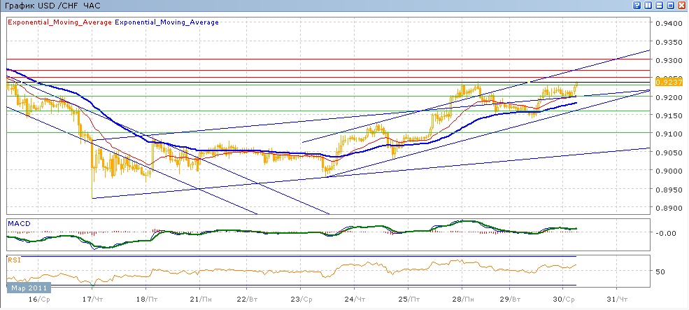 пара продолжает свой рост, начатый 23 марта. В понедельник пара, не сумев преодолеть сопротивление на 0.9230, откатилась вниз, закрывшись в районе 0.9180. вчера ,после небольшого снижения впервой половине дня, пара вновь выросла, сумев закрепиться выше 0.9200. каки в понедельник, она не смогла преодолеть 0.9230. С начала нынешней торговли пара (после неоднократного тестирования вниз 0.9200) растет, пытаясь преодолеть в очередной раз 0.9230. Средние скользящие ЕМА21 и ЕМА55 движутся вверх, индикаторы MACD и RSI сейчас находятся над своими центральными линиями.. На сегодня целями вверх станет отрыв от 0.9230, затем 0.9250 и 0.9270. Движение вниз направлено на 0.9200, 0.9160, далее 0.9100