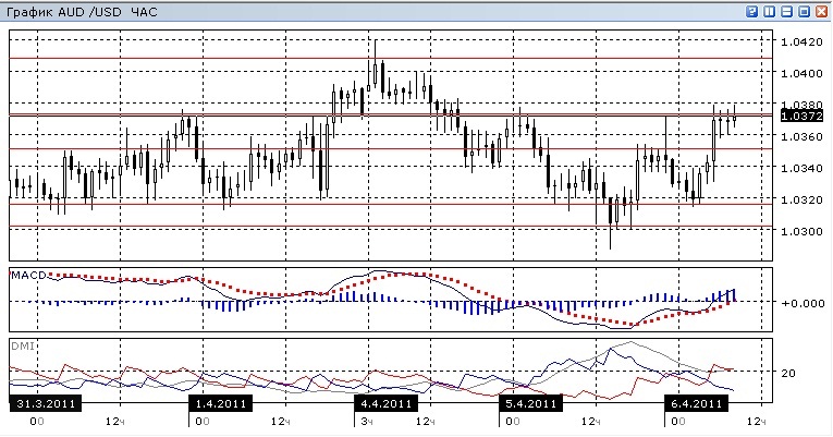 То, что на дневном графике является первыми признаками коррекции, на часовом графике предстает движениями между уровнями поддержки и сопротивления, образованными недавними ценовыми экстремумами. MACD растущий, соотношения между минимумами цены и минимумами MACD скорее говорит о продолжении роста. ADX также стал расти. Можно предположить, что пара по крайней мере вырастет до уровня 1,0401.