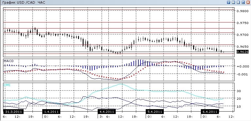На часовом уровне после отскока пара вернулась поближе к нижней границе нисходящего канала дневного графика. Совсем рядом уровень предыдущего относительного минимума на 0,9614. Вполне возможно, что этот уровень будет преодолён со второй попытки. Движение вниз подтверждает растущий ADX с превышением DM- над DM+. Быть более внимательным к подтверждению преодоления уровня поддержки стоит из-за сформировавшегося расхождения между минимумами цены и минимумами MACD.