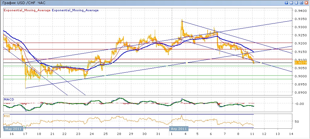 с начала апреля пара снижается, образовав нисходящий канал .из которого паре удалось выйти вниз в ходе сегодняшних торгов. В два предыдущих дня пара торговалась в нижней части канала. Средние скользящие ЕМА21 и ЕМА55 пересеклись вниз и снижаются, индикаторы MACD и RSI уже четвертый день находятся под своими центральными линиями. На сегодня целями вверх станет 0.9100, 0.9160, 0.9200. Движение вниз направлено на 0.9600, 0.9000, 0.8980