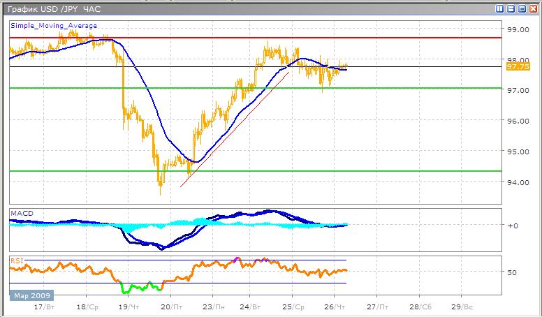 На сегодняшних торгах ожидается продолжение укрепления японской валюты против доллара США, которое началось вчера на фоне роста фондовых рынков, и отвращения инвесторов от американской валюты. Судя по укреплению японской валюты, оптимизм инвесторов относительно стимулирующих программ ухудшился, в среднесрочной перспективе ограничит рост пары. Технические индикаторы сигнализируют о падении моментума бычьего тренда, что может стать причиной плавного снижения, или торгов в боковом тренде. Осциллятор MACD подает слабый сигнал к покупке, при этом скользящие средние индикатора, снижаются, часто пересекаясь между собой. График индикатора RSI пересек среднюю линию под очень мелким углом, что достаточно ясно дает нам понять, что бычий тренд выдохся.