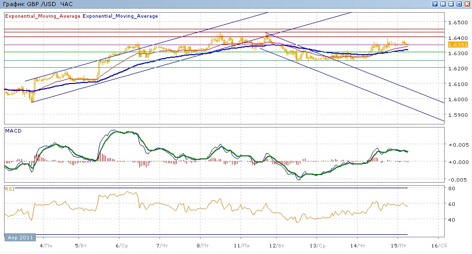 вся среда прошла в пределах бокового канала 1.6250-1.6300, границы которого в ходе торгов среды постоянно проверялись на прочность. Вчера пара преодолела отметку 1.6300 и концу торгов закрыласьв районе 1.6350. Сегодняшние торги проходят малоактивно, пара торгуется на уровне открытия, получая поддержку на 1.6350. Средние скользящие ЕМА21 и ЕМА55 пересеклись вверх и начали рост, индикаторы MACD и RSI вчера вышли вверх над своими центральными линиями и сегодня слабо снижаются. Цели на сегодня вверх — отрыв от 1.6350 к 1.6400, 1.6431 (максимумы 8 и 11 апреля), 1.6450. Движение вниз будет направлено на 1.6350, 1.6300, 1.6250