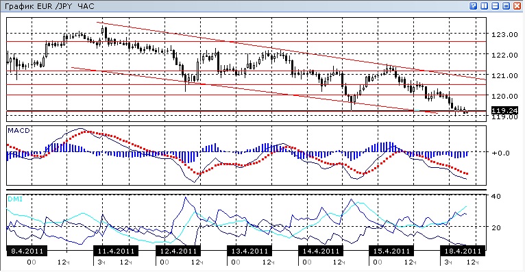 Если рассматривать движение пары с 8 апреля как движение в нисходящем канале, то в этом случае пара находится сейчас недалеко от его нижней границы. Можно предполагать и небольшой отскок, примерно до уровня 120,50.