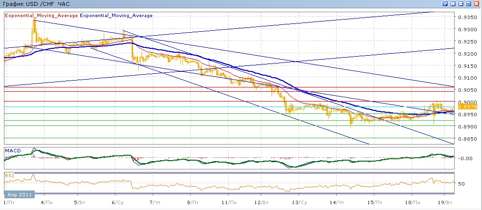 начатое с начала апреля снижение остановилось. После показанного нового рекордного минимума на 0.8893 на прошлой неделе, пара медленно росла, добравшись до отметки 0.9000 и закрывшись на 0.8980 в понедельник. С начала сегодняшних торгов пара торгуется на уровне открытия, упираясь в сопротивление на 0.8980. Средние скользящие ЕМА21 и ЕМА55 пересеклись вверх и медленно растут, индикаторы MACD и RSI вчера вышли над своими центральными линиями и сегодня немного снижаются. На сегодня целями вверх станет 0.8980,0.9000, 0.9040, 0.9060. Движение вниз направлено на 0.8920, 0.8900, 0.8850