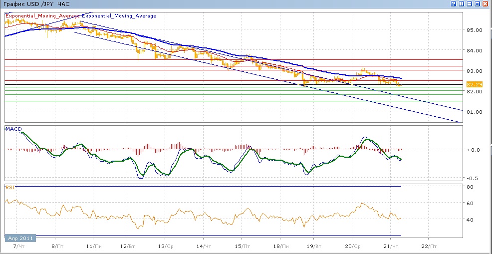 снижение пары пока замедлилось. Торги во вторник пара провела в достаточно узком диапазоне, вчера в начале торгов был рост к отметке 83.00, выше которой закрепитсья не удалось и пара начала снижатсья, закрывшись под 82.50. с начала сегодняшних торгов пара снижается, пытясь преодолеть минимум понедельника на 82.17. средние скользящие ЕМА21 и ЕМА55 продолжают снижение, индикаторы MACD и RSI, после вчерашнего роста, снова ушли ниже своих центральных линий и сейчас продолжают снижаться. Цели вверх на сегодня — 82.50, 83.00, 83.20, 83.50. Цели вниз — 8 2.00, 81.80, 81.50