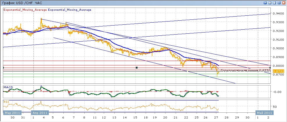 Пара по-прежнему продолжает находиться в нисходящем тренде, в верхней части канала. После показанного в среду нового минимума пара пыталась восстановиться (забравшись выше уровня 0.8800), но не удержалась и закрылась ниже этого уровня. Вчера пара птыалась продолжить снижение, но получила снова поддержку на отметке 0.8700. сегодняшние торги проходят очень спокойно, пара торгуется на уровне открытия. Средние скользящие ЕМА21 и ЕМА55 снижаются, индикаторы MACD и RSI продолжают находиться под своими центральные линии и сегодня слабо растут. На сегодня целями вверх станет 0.8750, 0.8770, 0.8800, 0.8850. Движение вниз направлено на 0.8700, 0.8668