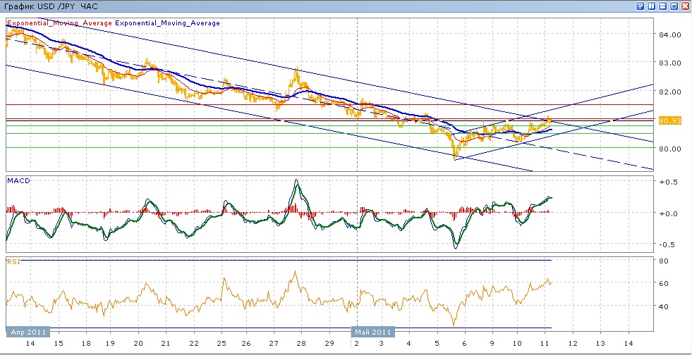 после того, как пара 5 мая «нырнула» ниже уровня 80.00, начался медленный ее рост в пределах нисходящего канала. С 6 мая пара не могла преодолеть сопротивление на 80.76, которое в ходе конца вчерашних торгов все-таки было преодолено и сегодня пара торгуется в попытках перодолеть уровень 81.00. кроме того, сейчас пара торгуется на верхней границе нисходящего канала, также пытаясь ее преодолеть, но пока безуспешно. Средние скользящие ЕМА21 и ЕМА55 медленно растут, индикаторы MACD и RSI, после вчерашней просадки, снова вышли над своими центральными линиями и сейчас немного снижаются. Цели вверх на сегодня — 81.00, 81.50. Цели вниз — 80.76, 80.50, 80.00