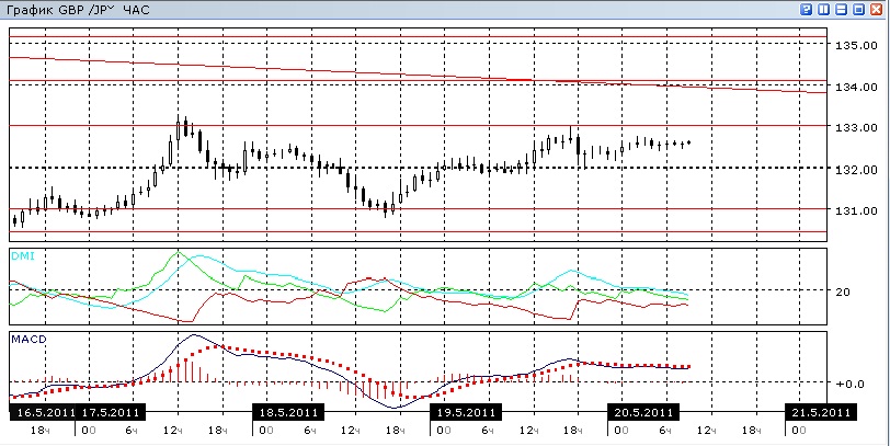 Период флэта продолжается, однако пара постепенно приближается к краткосрочной линии нисходящего тренда. На дневном графике индикаторы направленного движения показывают отсутствие определенности: линия MACD почти горизонтальна, ADX продолжает снижение , DM- и DM+ несколько дней находятся почти на одном уровне. На четырёхчасовом графике индикаторы скорее обозначают рост: линия MACD направлена вверх, DM+ выше DM-, ADX прекратил снижение и близок к росту. Однако уровень сопротивления 133,00, от которого пара за последние две недели четыре раза откатывалась вниз, пока даже не тестируется и вполне может послужить базой очередного отката. На часовом графике тоже можно наблюдать флэт, который иллюстрируется почти горизонтальной линией MACD и примерно равными DM+ и DM- при снижающемся ADX. Формирование на часовом графике свечей «дожи» добавляет оснований предполагать, что направление движение пары только будет определяться.