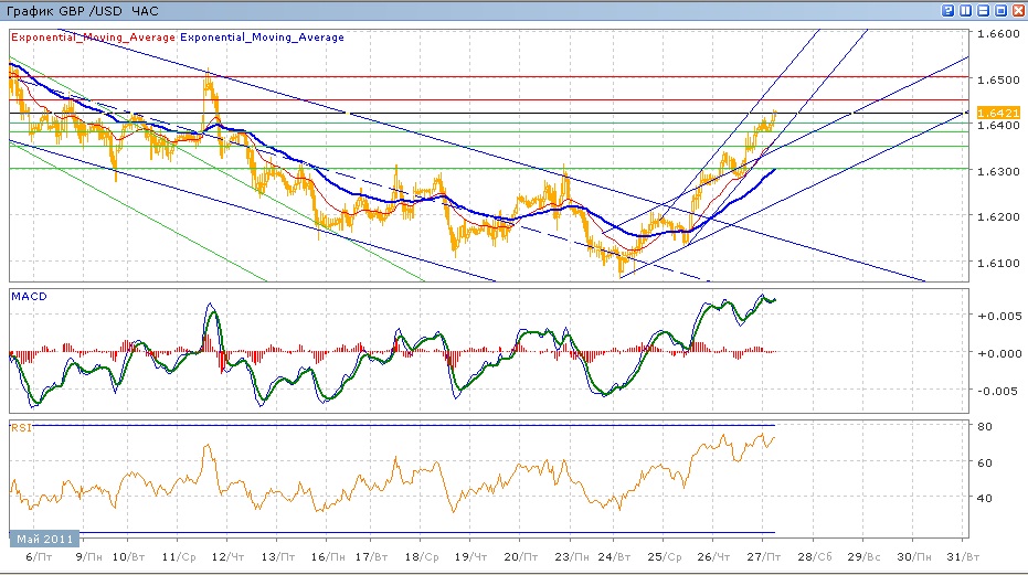 Пара с 24 мая начала расти в пределах нисходящего канала и в среду смогла выйти из него вверх, добравшись до отметки 1.6300. это сопротивление, которое сдерживало пару от роста с 12 мая, вчера было ею преодолено, пара добралась до двухнедельных максимумов. Сегодняшние тоги проходят с небольшим ростом, пара движется в усилившемся восходящем канале. Средние скользящие ЕМА21 и ЕМА55 пересеклись вверх и у\веренно растут. Индикаторы MACD и RSI со вторника находятся над своими центральными линиями и сегодня слабо снижаются.. Цели на сегодня вверх — 1.6450, 1.6500. Движение вниз будет направлено на 1.6400, 1.6380, 1.6350, 1.6300