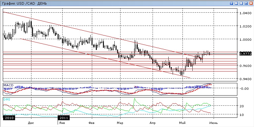 Продолжается движение в узком горизонтальном канале между уровнями 0,9760 и 0,9800. По индикаторам направленного движения в часовом масштабе можно можно сделать вывод о том, что такого движения нет — находящаяся около нуля гистограмма MACD и колебания около горизонтали линии MACD это иллюстрируют, вместе со снижением и так низкого ADX. На четырехчасовом графике остановка выражается не в изменчивости индикаторов, а в их противоречии друг другу: если по ADX еще есть рост так как DM+ остаётся выше DM-, то по MACD уже началось снижение, так как линия MACD направлена вниз, а гистограмма MACD ниже нуля. На дневном графике можно наблюдать замедление роста. Предпочтительным кажется направление вверх, но обоснованность такого взгляда на техническую картину невелика. Имеет смысл дождаться формирования тенденции.