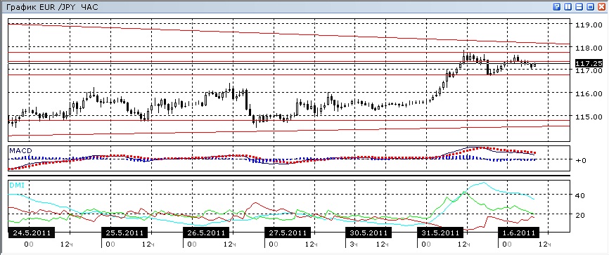 После выхода из канала пара приближается к линии нисходящего тренда, проходящей по максимумам апреля-мая. В данный момент она находится в зоне линии сопротивления 117,36. На дневном графике состояние флэта продолжается, так как пара не преодолела уровень ближайшего относительного максимума и индикаторы показывают на рост очень слабо, так как гистограмма MACD остаётся около нуля, а линия MACD почти горизонтальна.